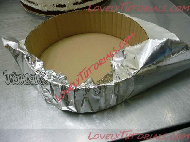 Кольцо торта надо разрезать на две половинки, так легче всего перенести, устанавливаем вокруг подставки.