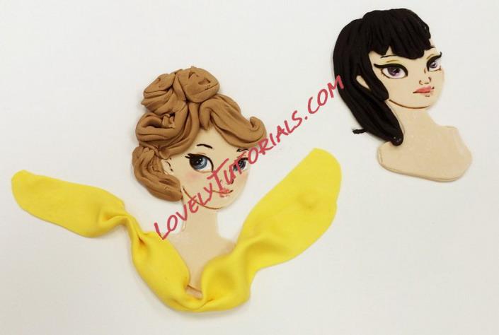 The figure on the left required me to paint in the whites of her eye. I used white gel food color for this. Make sure you shake the bottle first or it will be too thin to paint with. The irises are done with gel color also. Make sure you are thinking about where she is looking when you paint the eyes in! The character on the left has guides but the one on the right was a bit more challenging.