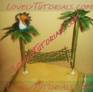 Раньше я делала пальмы почти по такому же принципу, за исключением того, что на ствол пальмы нанизывала лепешечки, и оставляла до полного высыхания мастики. В этот раз побоялась, что из-за тукана высушенные стволы не приклеятся к торту, решила обтянуть цветочной мастикой прямо на торте. Рассчитывала, на то, что цветочка хорошо прилипнет и быстро застынет на торте… и это было моей ошибкой! Пальмы никак не хотели крепиться к торту, их постоянно клонило в разные стороны. Ну, в следующий раз буду умней. Перед тем, как вставить шпажку с пальмой в торт, смазала айсингом, а правильно было б это сделать это шокоглазурью.