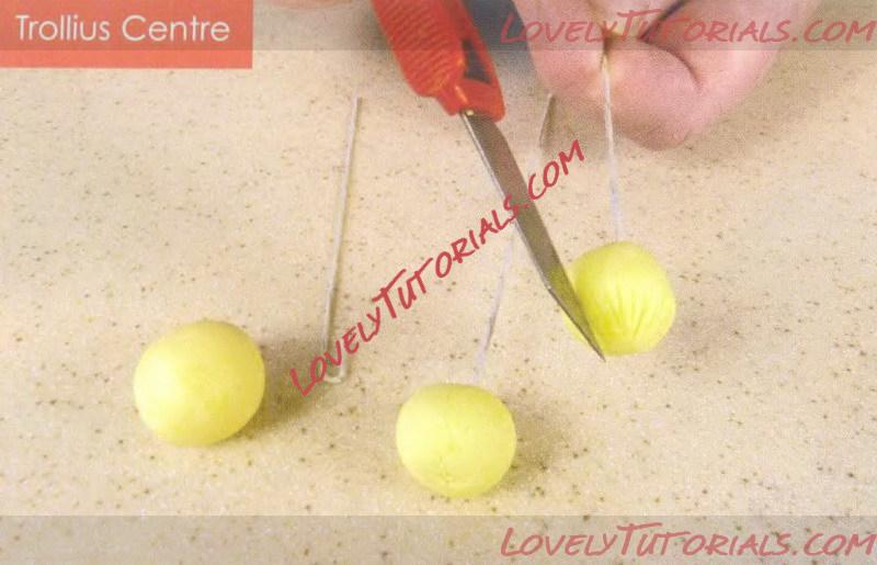 1 Thread a large ball approximately 12mm ('/2in) wide of yellow paste onto a hooked 20g wire. Mark lines lengthways with a craft knife or wheel tool to represent the stamens. Leave to dry.