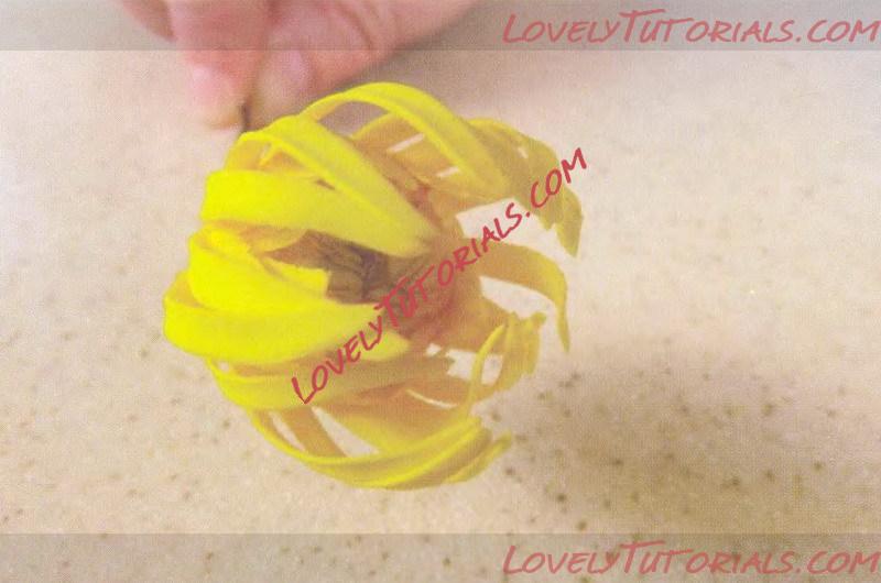 2Cut out a daisy shape in yellow paste with the second or third sized cutters. Use a cel stick to broaden each petal. Divide each petal four to five times with a craft knife. Thread the shape onto the wire and close the petals around the centre.
