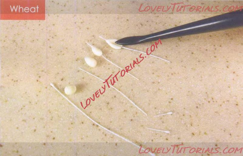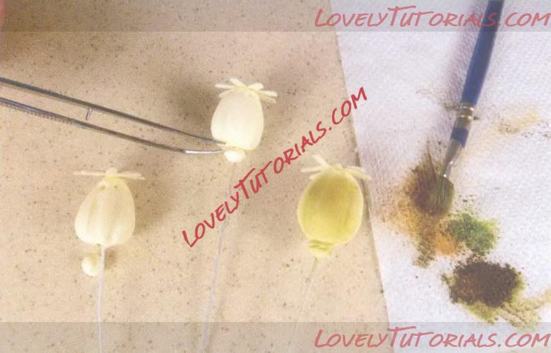 12 Add a small sausage of paste to the base of the seed head. Pinch a ridge around this half way down with tweezers. When dry dust with cream and overdust in places with a little nutkin and moss.