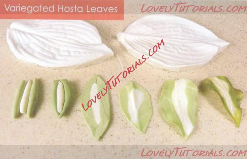 19Place a cream sausage of paste between two green ones. Roll slightly with a large rolling pin then make a ridge. Cut out a leaf shape and thread on to a 24g wire. Vein with a hosta leaf veiner. Dust the edges with kiwi, steam and glaze.