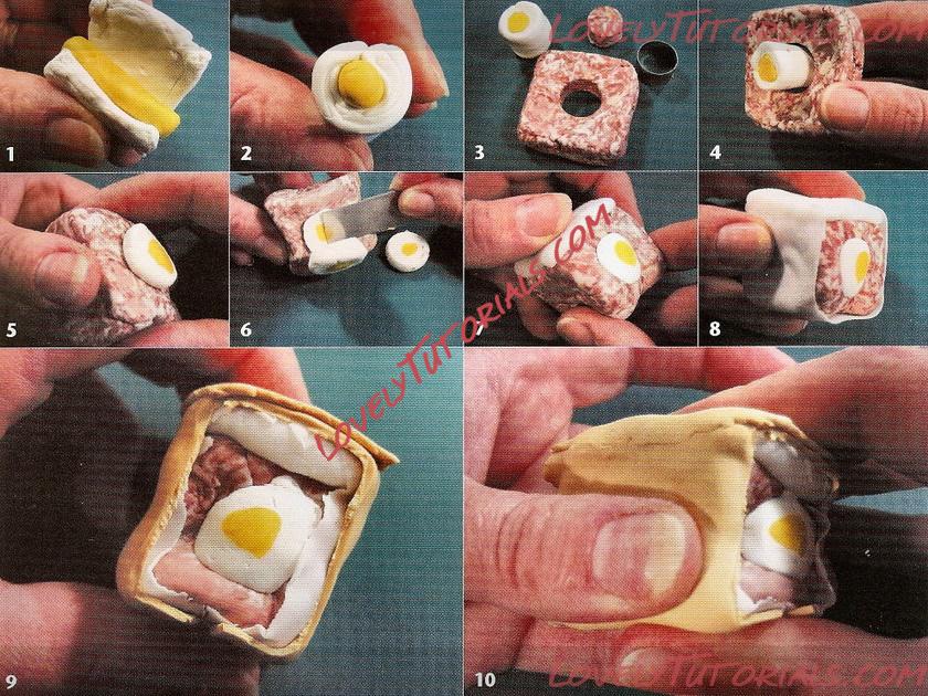 4 and 5 Insert the egg cane through the hole in the middle of the meat square.